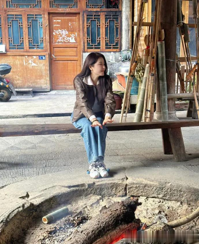 曾黎的中年穿搭真时髦! 棕色夹克+白色翻领衫+牛仔裤, 减龄又高级