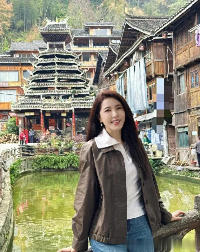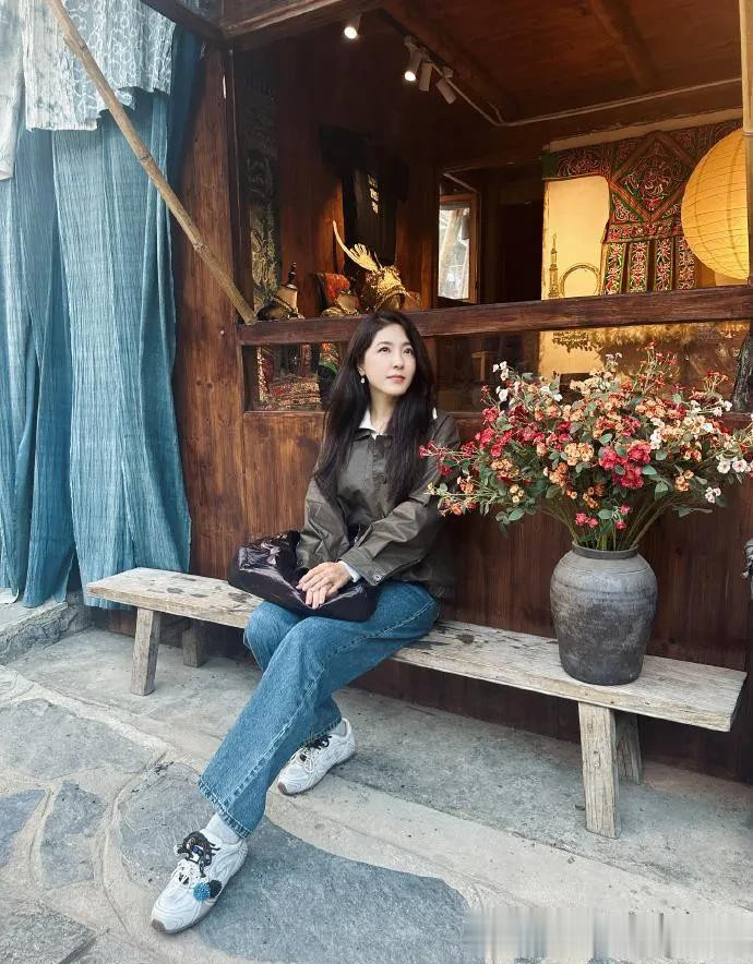 > 曾黎的中年穿搭真时髦! 棕色夹克+白色翻领衫+牛仔裤, 减龄又高级